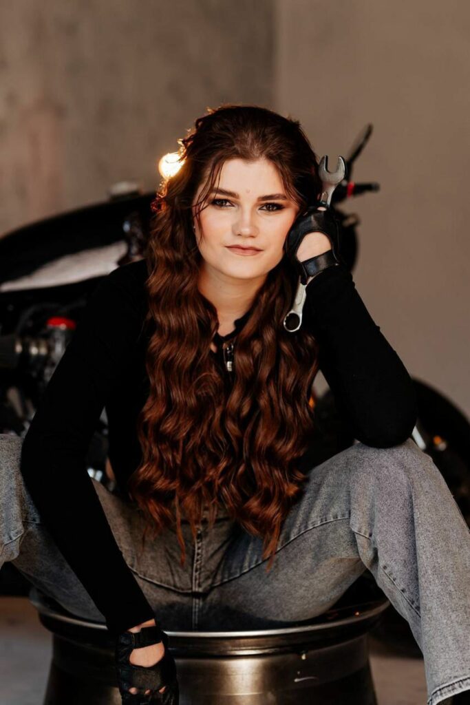 «На цьому мотоциклі “Kawasaki” колись їздив мій батько. Коли мені виповнилося 14, тато вирішив, що час спробувати. Пам’ятаю той день: на коліні досі залишився шрам. Я розуміла, як керувати, але його вага – понад 200 кілограмів – була надто великою для 14-річної дівчини. Я різко загальмувала і впала. Тоді я плакала, і батько вирішив продати мотоцикл. Він стояв три роки, а я молилася, щоб його ніхто не купив. Часом я приходила до гаража, коли батька не було, сідала на мотоцикл і думала: “Чому я не можу ним керувати?”. Але згодом батько дав мені ще один шанс».